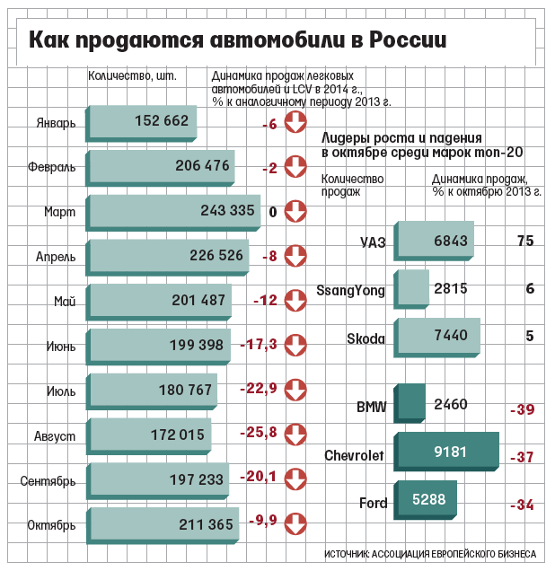 Продажи выросли у семи марок из числа вошедших в октябре в список 20 самых популярных, в том числе у Lada (+1%, по валовым продажам она лидер рынка); а самый быстрый рост (+75%) продемонстрировала другая российская марка - УАЗ. Сильнее всего продажи упали у BMW (на 39% по сравнению с октябрем 2013 г.), далее следуют Chevrolet (минус 37%) и Ford (минус 34%).