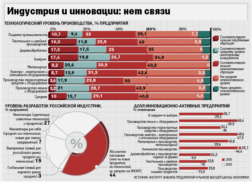 По данным лаборатории конъюнктурных опросов Института экономики переходного периода (ИЭПП), с 2005 по 2008 г. доля компаний, не занимавшихся инновациями, выросла с 9% до 18%, к августу 2009 г. из-за кризиса достигла 23%. Реальных же инноваторов гораздо меньше, подтверждает замдиректора Межведомственного аналитического центра Юрий Симачев, к ним можно отнести лишь порядка 10% предприятий – именно столько в докризисную четырехлетку увеличили расходы на НИОКР.