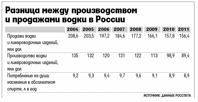 За 10 лет, по данным Росстата, продажа водки сильно сократилась: в 2001 г. – 209,1 млн дал, а в 2011 г. – 156,4 млн. Производство коньяков выросло за тот же период в 2,5 раза, игристых вин – в 1,5 раза, пива – в 1,6 раза.