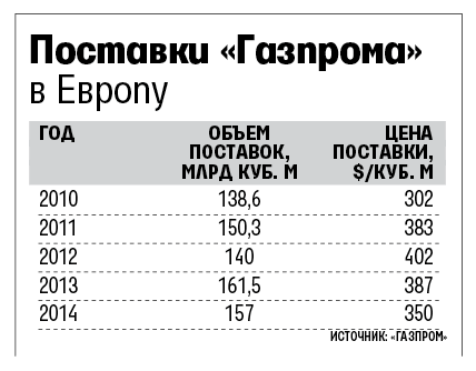 Это может повториться и в отчетности «Газпрома» по МСФО за II квартал, предупреждает директор Small Letters Виталий Крюков. В целом тенденция для «Газпрома» пока не самая благоприятная, говорит он. Компания снижает прогноз экспорта в Европу. В 2014 г. он составит 157 млрд куб. м (на 3% ниже 2013 г.), заявил вчера замначальника департамента «Газпром экспорта» Михаил Мальгин (его цитировал «Интерфакс»). В июне прогноз был 158,4 млрд куб. м. Продолжит снижаться и цена, средняя по году составит $350 (на 6% ниже цены I квартала). Таким образом, выручка «Газпрома» от продаж в Европу по итогам 2014 г. составит $55 млрд, что на 12% ниже прошлого года и самый низкий показатель европейской выручки с 2010 г. Причем этот прогноз не учитывает конфликт с Украиной, пишет Bloomberg со ссылкой на источники.