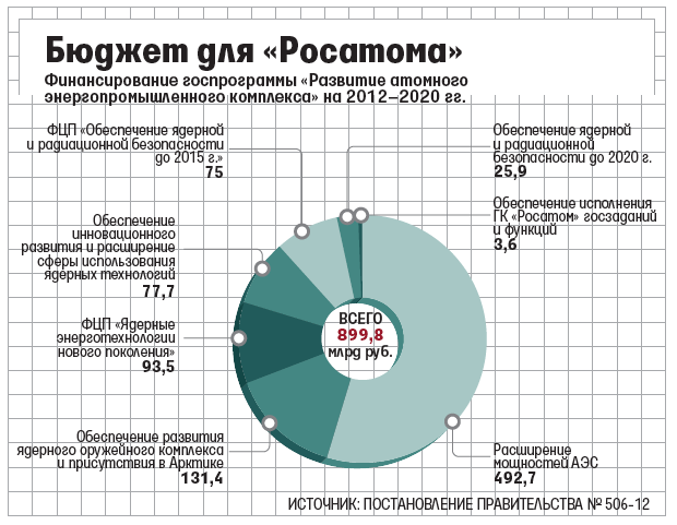 В 2012-2020 гг. на атомный комплекс предполагалось выделить 899,7 млрд руб., следует из постановления правительства от 2 июня 2014 г. Большую часть - 492,7 млрд руб. - на АЭС в России (см. график).