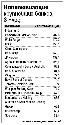 С рыночной капитализацией в $62,4 млрд (на 21.00 мск, см. таблицу) Сбербанк вошел в топ-20 банков по капитализации. Вчера он делил 17–18-е места с US Bancorp, а в ходе торгов поднимался на 16-е место, обгоняя Australian & New Zealand Banking Group. Позади остались такие гранды, как BNP Paribas, Deutsche Bank и др. Среди банков Европы и США он занимает 7-е место, причем среди европейских уступает только HSBC.