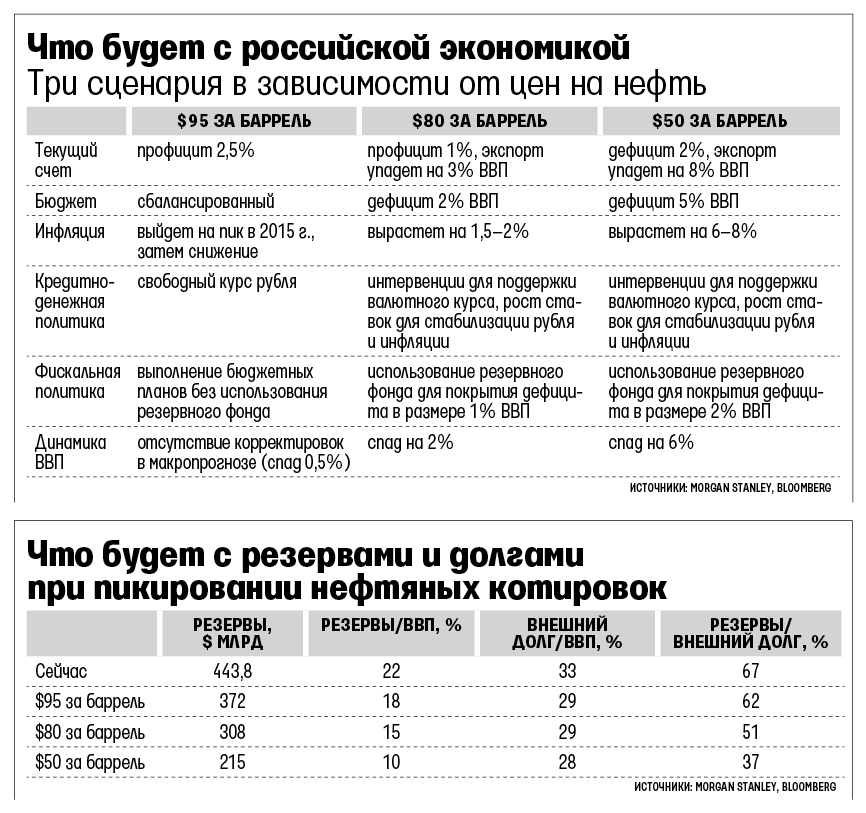 По данным Bloomberg, баррель нефти марки Brent с начала года подешевел на 22,5%, рубль - на 21,9%. Снижение цены на 10% приводит к потере $32,3 млрд доходов от экспорта нефти и газа - это 1,6% ВВП, подсчитали в Morgan Stanley. Если цены зафиксируются на уровне $80, то спад ВВП достигнет 2%, инфляция вырастет на 1-2%, экспорт упадет на 3% ВВП, потребуются интервенции в поддержку рубля и расходы в 1% ВВП из резервного фонда, предупреждают в Morgan Stanley. При снижении цен до $50 спад ВВП углубится до 6%, экспорт сократится на 8%, инфляция вырастет на 6-8%, ЦБ придется поднимать ставки для стабилизации курса рубля, резервы сократятся почти вдвое до $215 млрд.