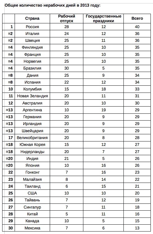 Россия заняла первое место в мире по числу нерабочих дней в 2013 г., утверждают специалисты портала Hotels.com, сравнив число дней официального отпуска и выходных, связанных с государственными праздниками, в 40 крупнейших странах мира.