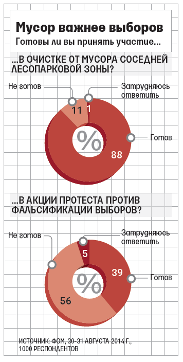 Основатель общественной организации «Городские проекты» Максим Кац также считает, что люди дают социально одобряемые ответы: «Молодым людям, с которыми я работаю, неинтересна уборка мусора, им интересно убеждать власть, что город идет не в том направлении: на это они готовы скидывать деньги, готовы ходить на такие мероприятия». Вспоминается зима 2011 г.: за две недели до Болотной социологи тоже говорили, что люди не готовы выходить на улицу, поэтому все эти опросы не имеют ничего общего с реальностью, подчеркивает Кац.