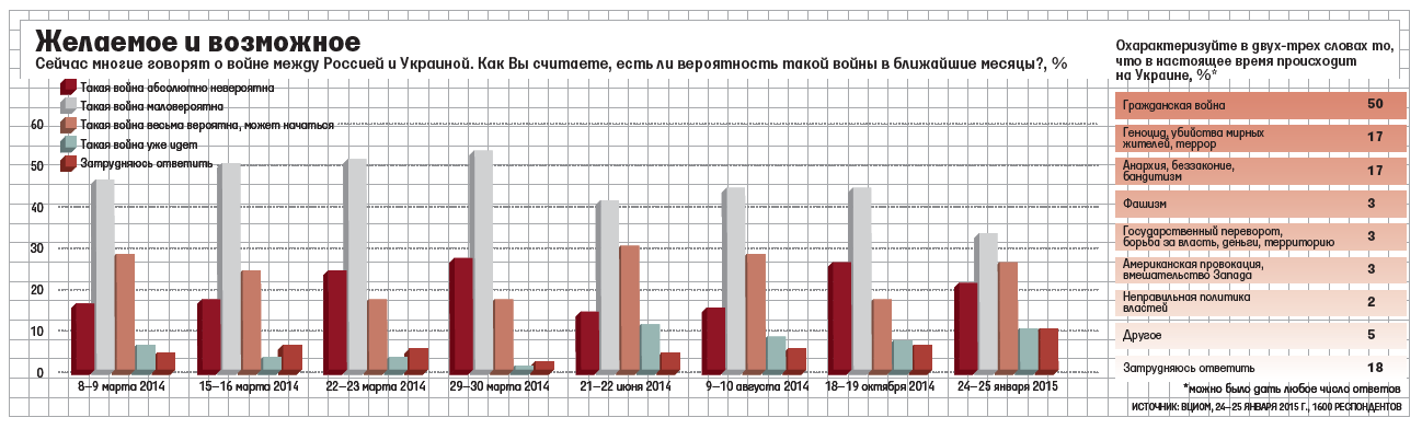 Одна из главных тенденций - что с лета люди продолжают описывать происходящее как гражданскую войну, эта точка зрения до сих пор доминирует, говорит директор ВЦИОМа Валерий Федоров. Вялотекущее перемирие перешло к следующей фазе - новому обострению конфликта, поэтому возросло и количество тех, кто считает войну возможной, объясняет социолог: «Надежды на минские соглашения улетучились, заморозить конфликт не получилось, вероятность войны увеличилась». Лишь 3% называют происходящее вмешательством Запада, потому что мы не спрашивали о причинах - тогда ответы были бы совсем другие, уверяет Федоров.