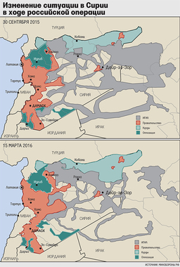 Во вторник начался вывод из Сирии основной части российской военной группировки, которая с сентября 2015 г. наносила удары по террористам, поддерживая действия сирийской армии. Во вторник звено российских бомбардировщиков Су-34 вылетело с авиабазы Хмеймим в провинции Латакия и приземлилось на аэродроме «Балтимор» в Воронеже, где летчикам была организована торжественная встреча с участием главкома ВКС Виктора Бондарева. По сообщению Минобороны, вместе с бомбардировщиками Сирию покидают авиатехники, а военно-транспортными самолетами вывозится техническое имущество. По словам человека, близкого к Минобороны, из Латакии будут выведены новейшие бомбардировщики Су-34 и штурмовики Су-25. При этом на базе останутся прикрывающие ее истребители Су-30 и Су-35, которые являются многофункциональными и могут наносить удары по земле, а также эскадрилья бомбардировщиков Су-24. Останется в Сирии и эскадрилья ударных вертолетов Ми-24 и Ми-35. По словам собеседника «Ведомостей», этих сил должно хватить для обороны базы и поддержки наступления сирийской армии против «Исламского государства» (ИГ, запрещено в России) в районе Пальмиры – во вторник российские самолеты уже наносили там удары в интересах сирийских войск.