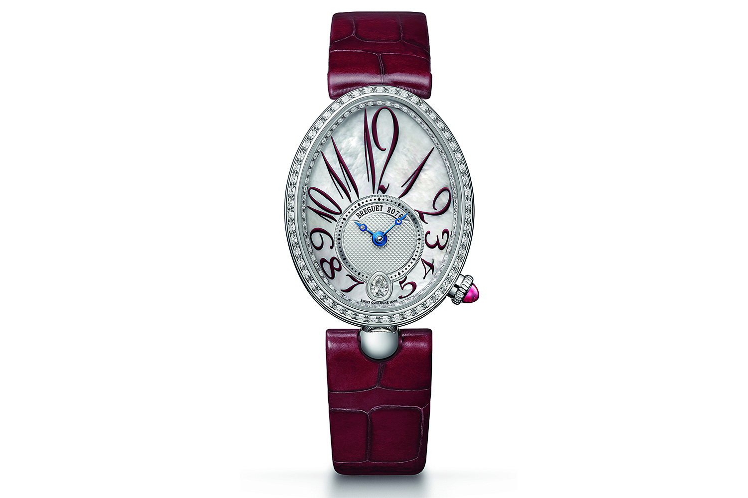 В коллекции Marine теперь представлены три модели в корпусе из титана и на титановых браслетах. Marine 5517 с указателем даты – одна из них. Легкий и прочный материал удачно подчеркивает спортивный характер линии и совершенно не противоречит элегантному стилю Breguet, лишь придает ему современное звучание. Очередная интерпретация женских часов Reine de Naples – модель под номером 8918 – исполнена в красном цвете оттенка граната: арабские цифры на перламутровом циферблате, рубин на заводной коронке и ремешок из кожи аллигатора.