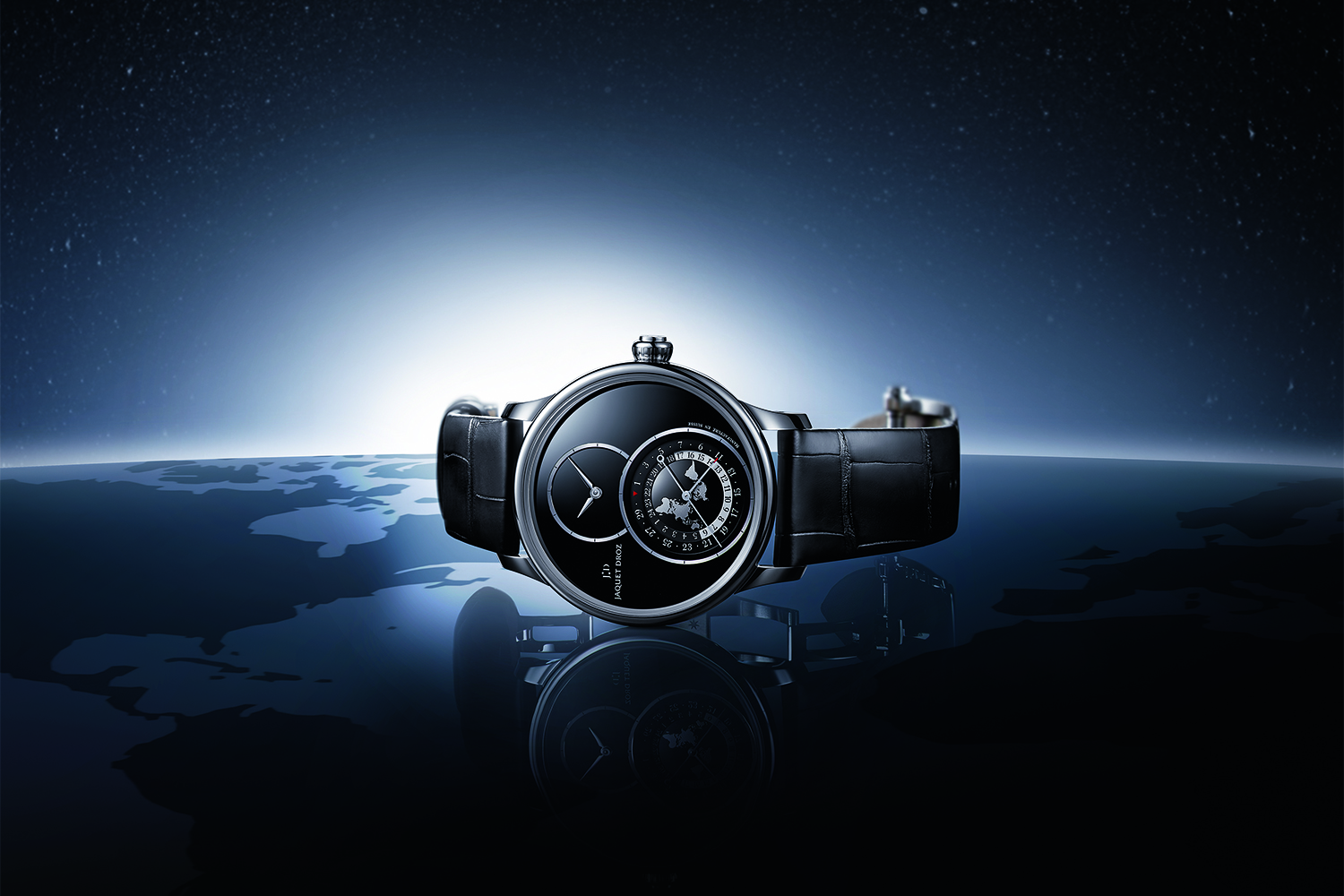Эстетика часов Grande Seconde Dual Time с ее индикатором времени второго часового пояса в нижней части «восьмерки» циферблата претерпела существенные изменения: теперь центральную часть индикатора занимает карта с очертаниями континентов с Северным полюсом в центре – так называемая полярная азимутальная проекция. При этом 24-часовая индикация домашнего времени разделена на два сегмента по 12 часов каждый, что позволяет легко отличить дневное время (сегмент белого цвета) от ночного (сегмент черного цвета).
