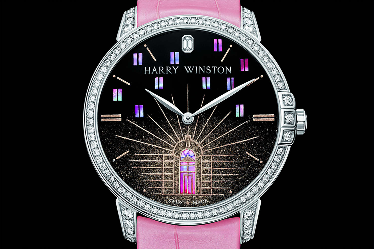 Среди большого разнообразия циферблатов новых женских ювелирных часов Harry Winston, исполненных в сложных декоративных техниках микромозаики, маркетри, инкрустации драгоценными камнями, можно выделить модель Harry Winston Midnight Yozora Automatic. Ее циферблат – миниатюрное произведение искусства, созданное в союзе с японской компанией Nakaya. Знаменитая арка на входе в салон Гарри Уинстона на Пятой авеню и ночное небо Нью-Йорка выполнены вручную с использованием старинных японских художественных приемов: лака уруси, техник радэн и «посыпанной картины» маки-э.