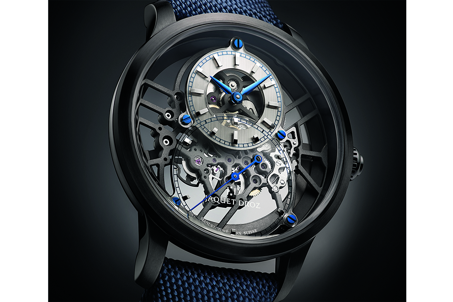 Еще в 2018 году часовщики Jaquet Droz создали в коллекции Grande Seconde скелетонизированную версию механизма Skelet-One, по сути без циферблата как такового, и теперь она помещена в корпус 41,5 мм из керамики. Этот прогрессивный материал, винты из синей вороненой стали и синий текстильный ремешок придают Grande Seconde Skelet-One современный облик.