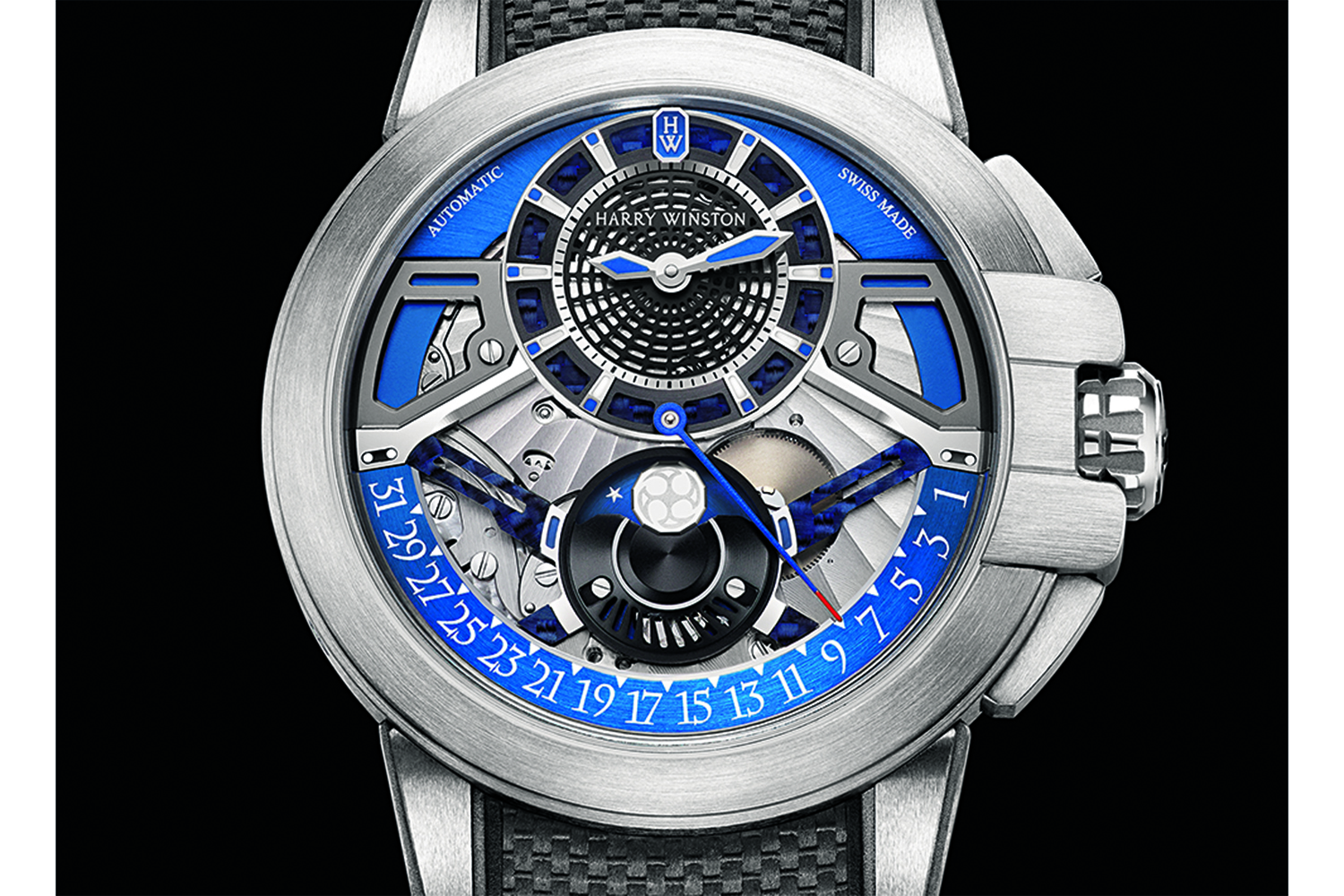 Тринадцатый год подряд продолжая эксперименты с высокотехнологичным сплавом Zalium, часовщики Harry Winston создали Project Z13, первую модель в этой коллекции не только с ретроградным указателем даты, но и с фазой Луны – за их работу отвечает калибр HW3202. Вся нижняя половина часов как раз отдана под внушительных размеров ретроградный указатель, он же диктует всю затейливую архитектуру скелетонизированного циферблата. Образом небесного светила на указателе фаз Луны стал сюрикен или звезда, а привычно круглую форму диска заменила его 12-угольная интерпретация.