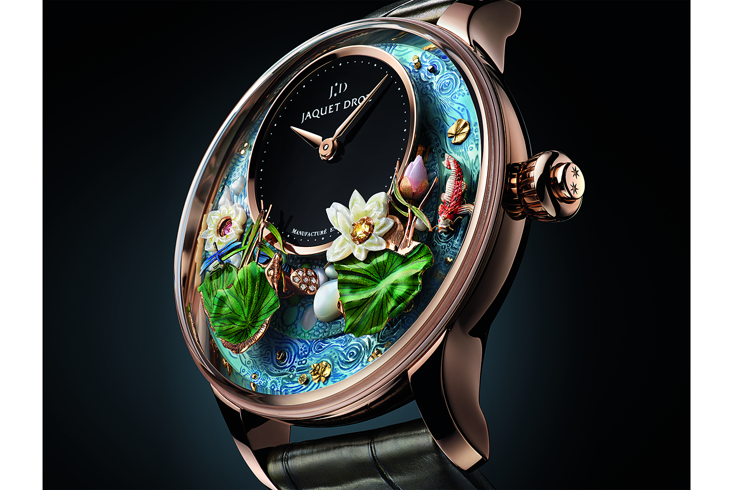 Восемь полных вращений по 30 секунд каждое выполняют цветок лотоса, вырезанный из перламутра, кувшинки из золота, украшенный гравировкой и бьющий хвостом карп кои и еще один плавающий в воде (исполненной в технике миниатюрной живописи) лотос.