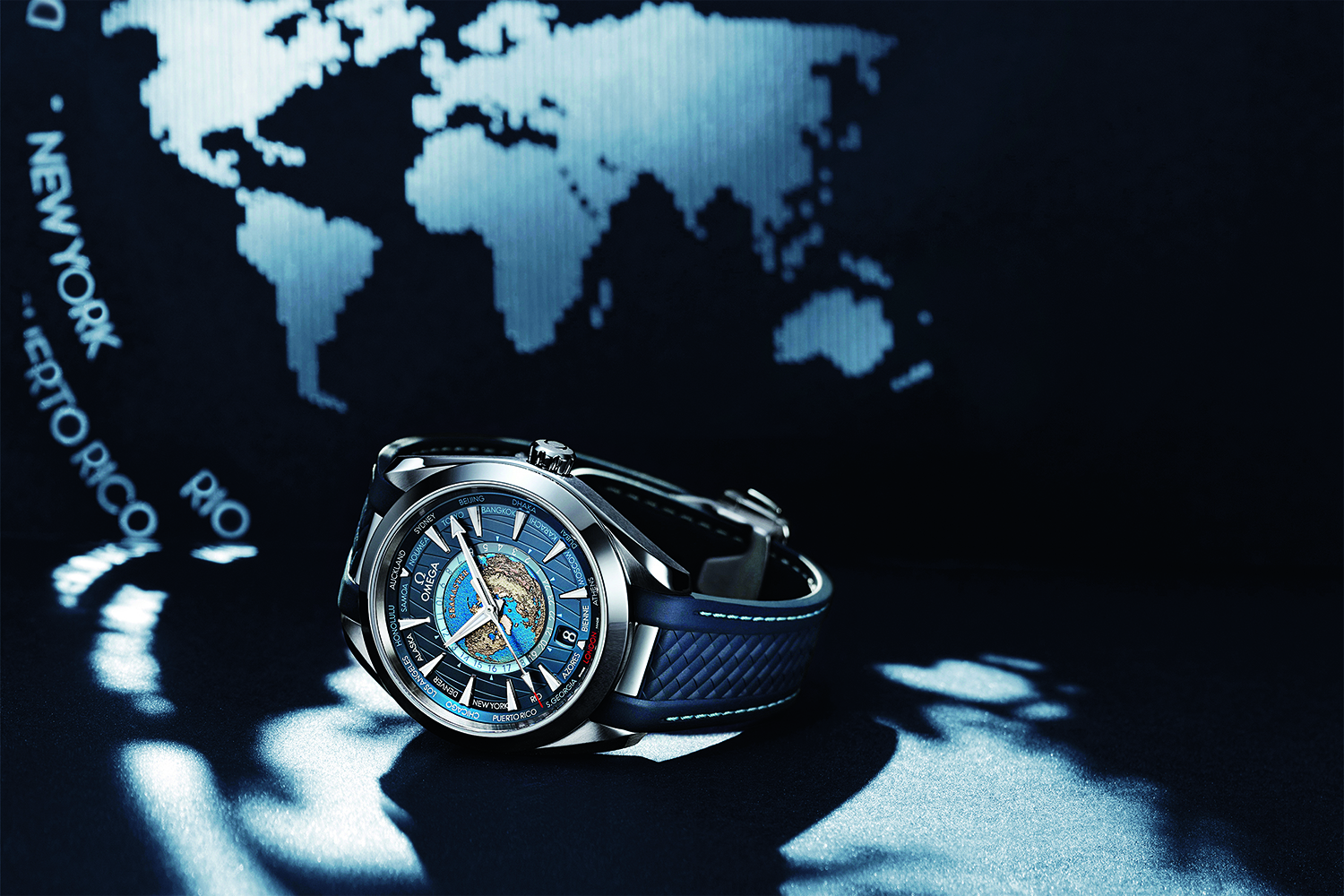 В центре циферблата новой версии модели Seamaster Aqua Terra Worldtimer на пластине из титана Grade 5 помещено рельефное изображение Земли, видной с Северного полюса. Вокруг нее находится кольцо из хезалитового стекла с 24-часовой шкалой: голубым цветом на нем обозначено дневное время и темно-синим – ночное. Среди названий городов мира по окружности циферблата, на шкале GMT+1, теперь можно видеть город Бьен – родину Omega.
