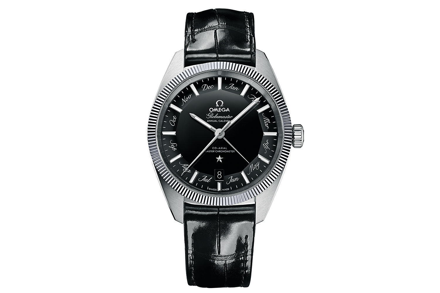 Знаменитая модель Constellation Globemaster Annual Calendar впервые исполнена в нынешнем году в черном цвете, который гармонично сочетается и со стальным корпусом 41 мм, и с безелем с характерными насечками, и с архитектурой 12-гранного циферблата Pie Pan, каждая из граней которого заключает тот или иной месяц.