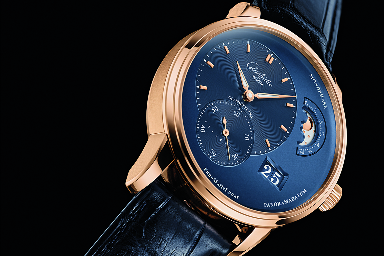 Модель PanoMaticLunar – новая классика в коллекции Pano немецкой мануфактуры в корпусе диаметром 40 мм из красного золота с циферблатом темно-синего цвета. Его асимметричный дизайн обусловлен расположением всех указателей: часовой/минутный и малый секундный циферблаты расположены вдоль вертикальной оси с левой стороны, панорамный указатель даты с белыми цифрами на синем фоне находится под отметкой «4 часа». В новинке на отметке «2 часа» к ним добавлен указатель фазы Луны, на котором золотистое светило и звезды рассыпаны по серебристому небосклону.