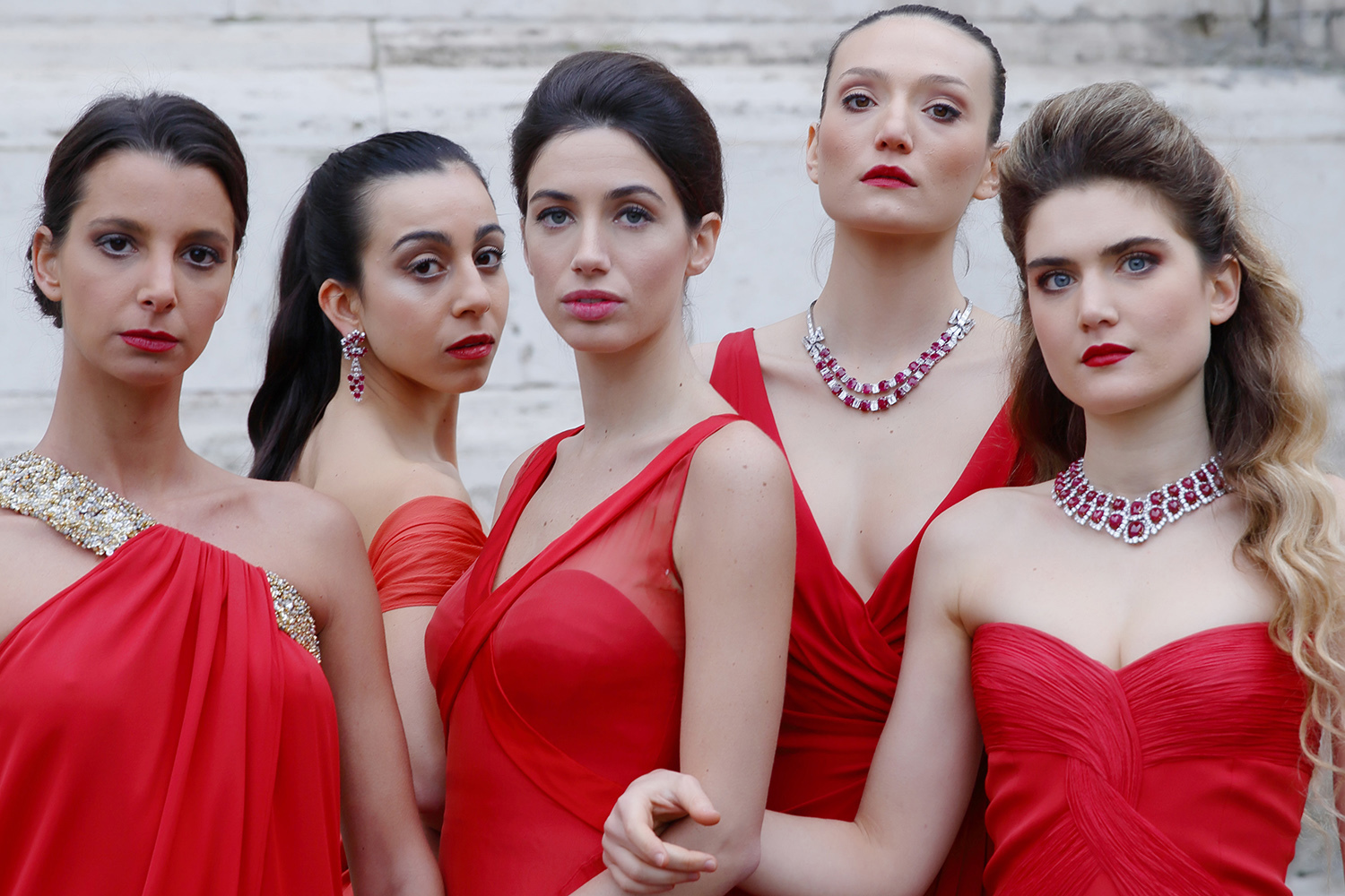 Красные платья haute couture, созданные Валентино Гаравани, дополнены бриллиантами и рубинами из коллекции Bvlgari Heritage