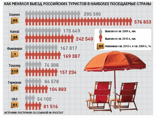 В лидерах по популярности у россиян, по данным Ростуризма, оказались Египет – более 576 850 человек (+95%), Китай – более 242 500 человек (+38%), Финляндия – 169 000 (+1%), Таиланд – 157 000 (+112%). Больше, чем в прошлом году, российских туристов отправилось также в Австрию (+15%), Великобританию (+28%), Германию (+24%), Испанию (+27%), Италию (+26%). Из 23 представленных стран в минусе оказалась лишь Греция: туда отправилось на 7% меньше россиян.