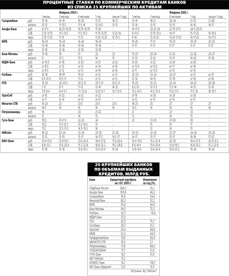 В прошлом году банки продолжали наращивать свои кредитные портфели, но гораздо медленнее, чем раньше. Крупнейшие предприятия предпочитают привлекать более дешевые средства из-за границы, а российским банкам не удается компенсировать эту потерю за счет кредитования средних и мелких клиентов, в частности физлиц. Весь прошлый год банки продолжали активно кредитовать предприятия реального сектора: по данным ИЦ "Рейтинг ", за 2002 г. кредитный портфель 150 крупнейших банков вырос на 35,8%, а в реальном выражении (с учетом инфляции) - на 18%. Однако годом ранее эти показатели были гораздо выше - 57% и 35% соответственно.