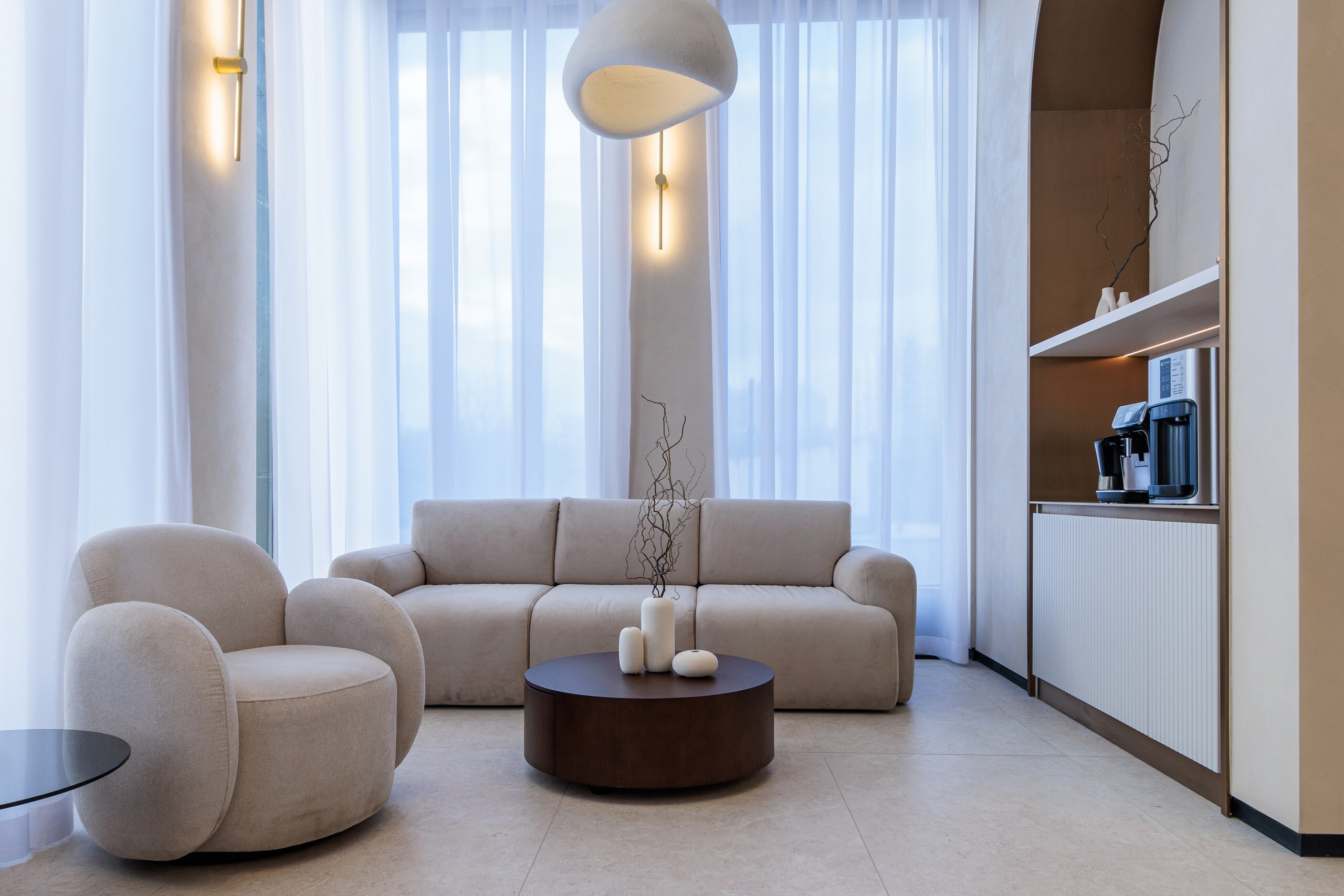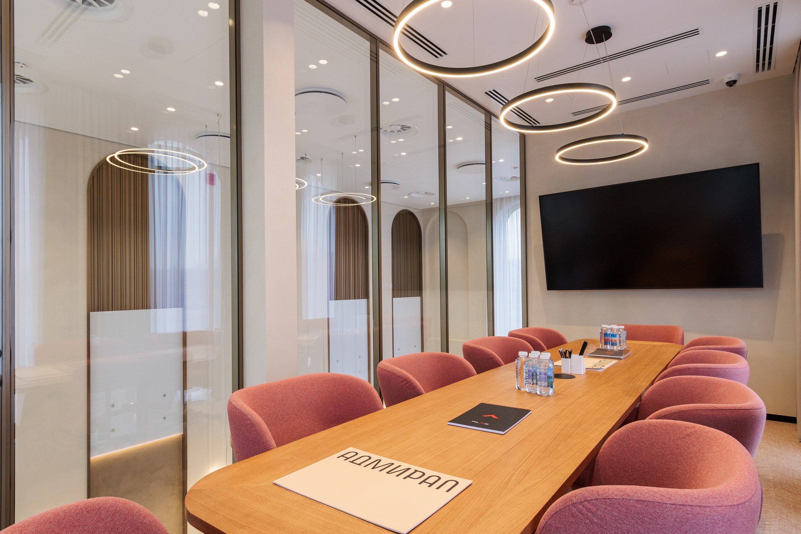 Двухэтажное здание площадью 500 кв.м со светлыми фасадами и арочными окнами созвучно архитектурной концепции «Адмирала». Дизайн интерьеров разработан бюро LIFEFORMS и выполнен в стиле «джапанди», для которого характерна минималистичная цветовая палитра и природные оттенки.