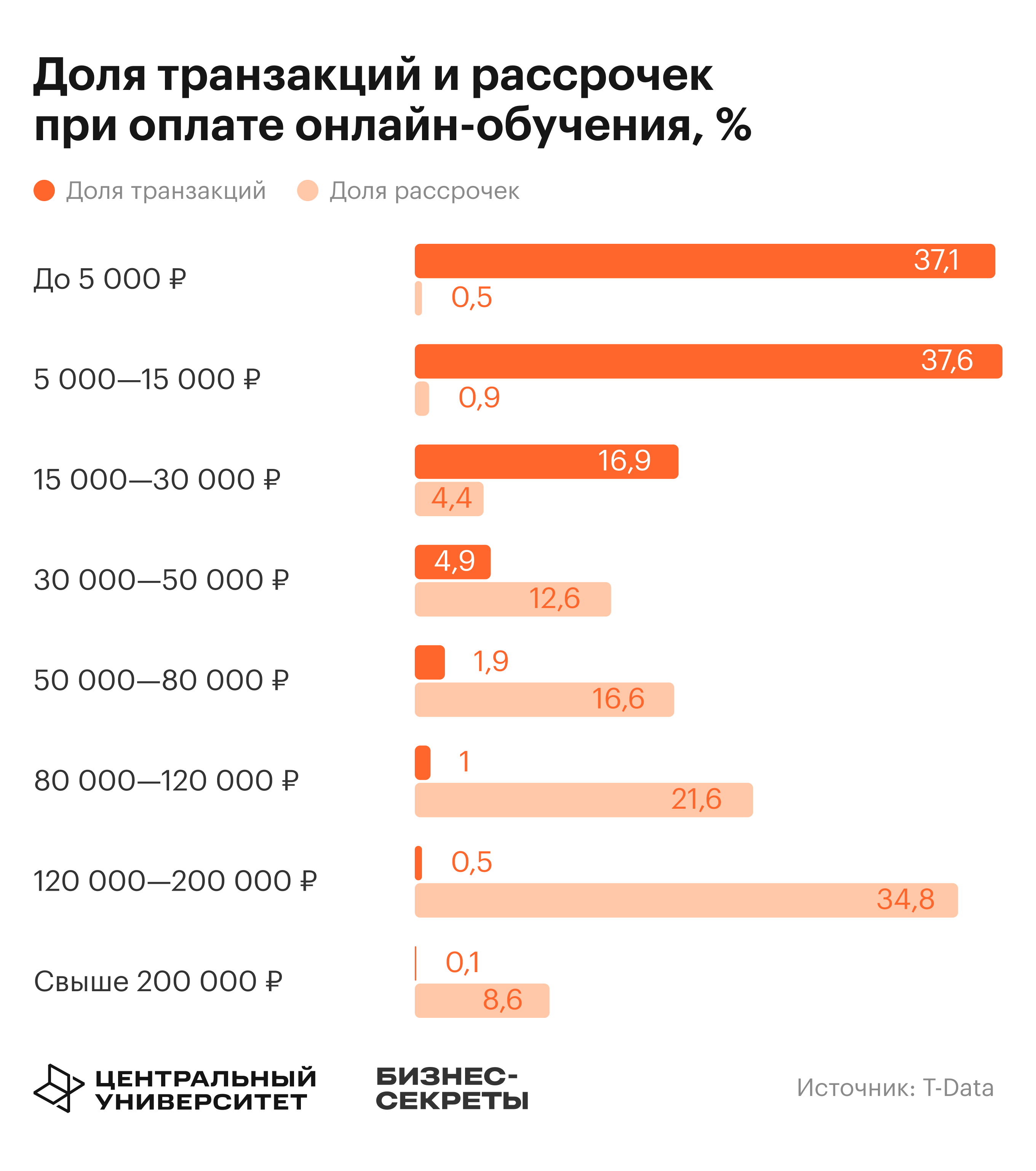 Пиковый спрос на рассрочку ИТ-обучения зафиксирован в диапазоне 120 000 — 200 000 ₽, а в детском обучении — с 30 000 ₽ до 80 000 ₽.