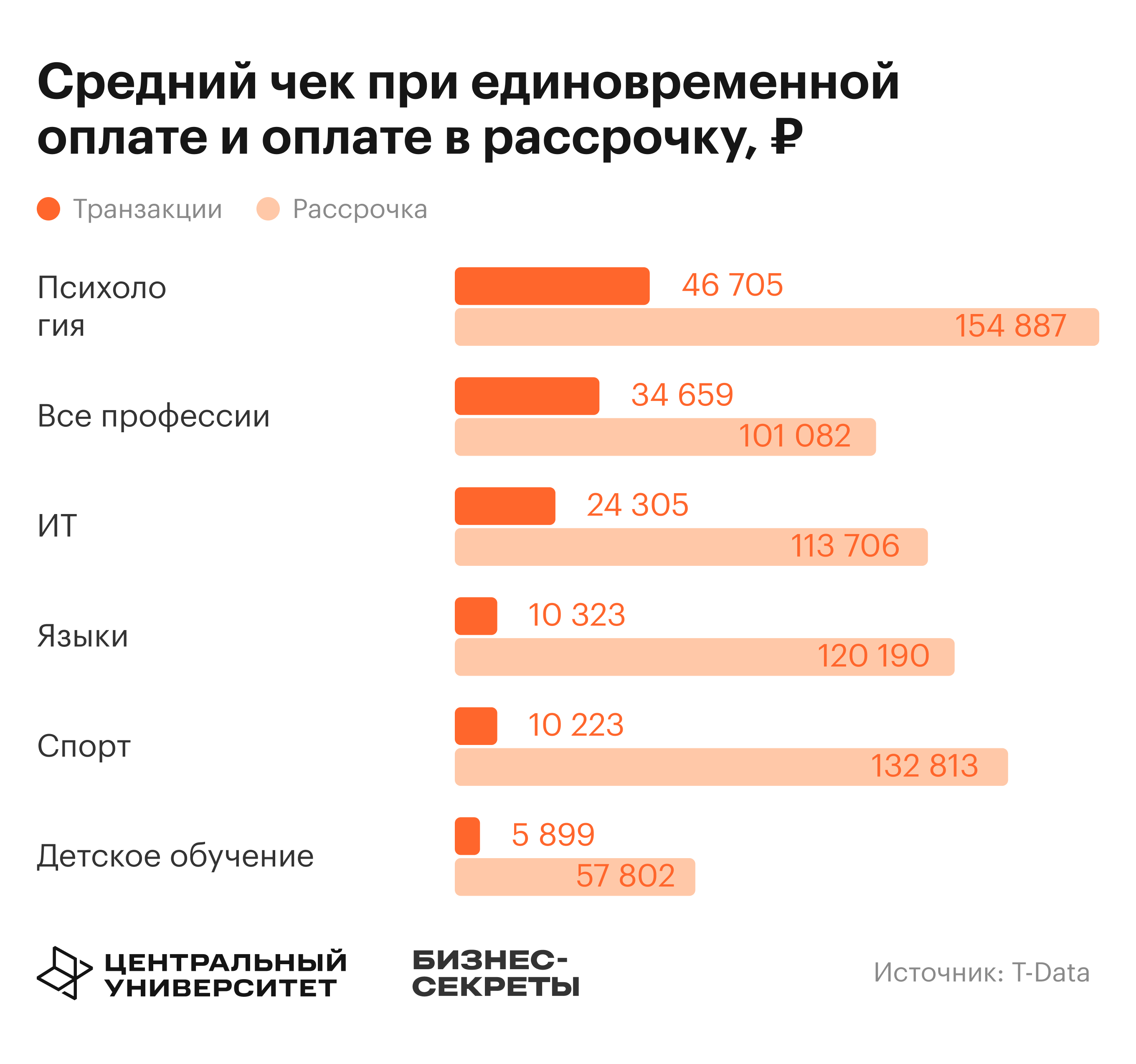 Средний чек покупки в рассрочку в 3—13 раз выше чека единоразовой оплаты, наибольшая разница — в спортивном, детском и языковом обучении.