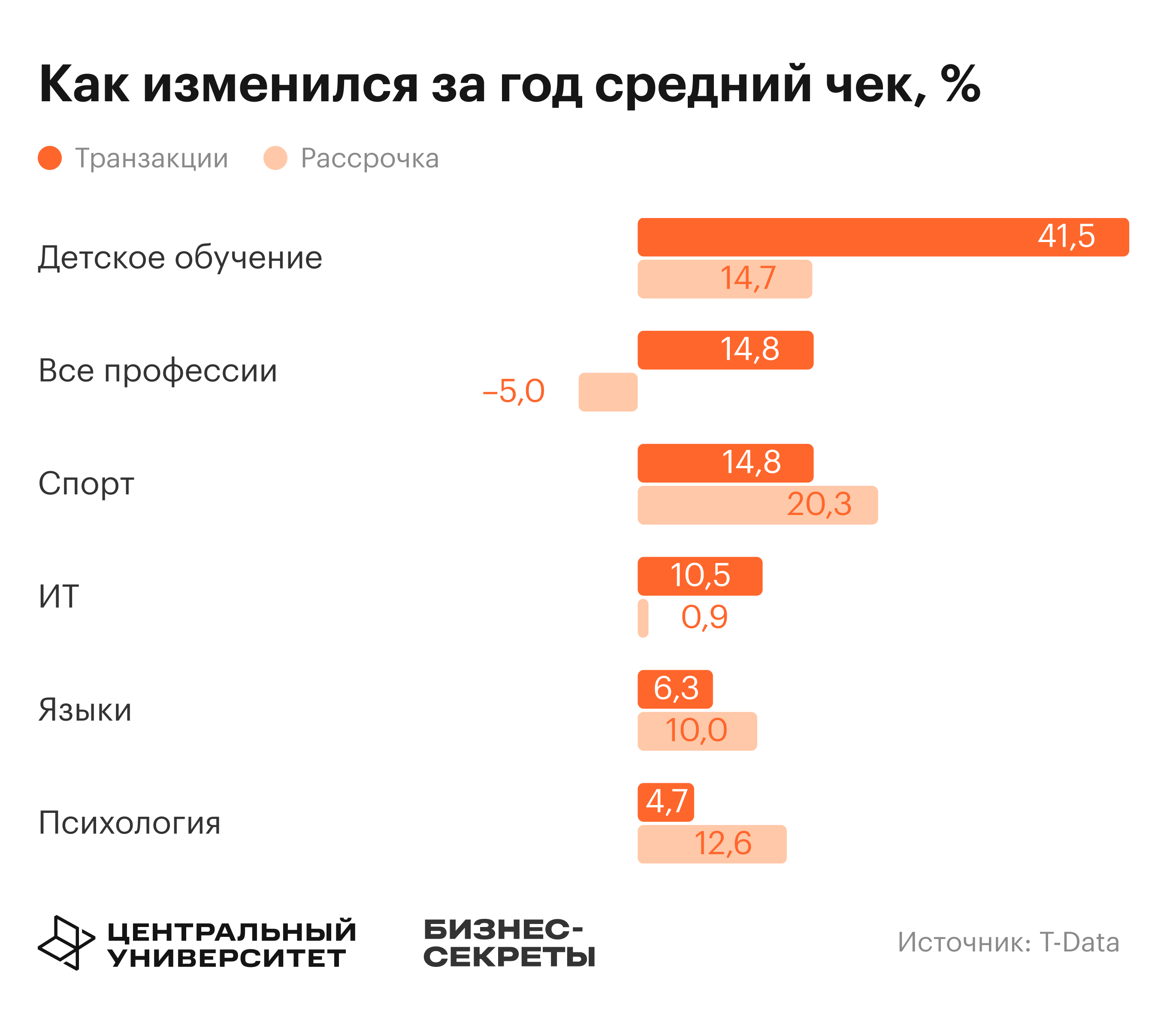 В психологическом сегменте тренд другой. Средний чек при транзакциях вырос незначительно — динамика чуть менее 5%. Зато средний чек при оплате в рассрочку вырос на 12,6% год к году. Тренд связан с развитием более премиальных продуктов в этом сегменте: потребители заинтересованы в оплате дорогостоящего обучения, но не имеют возможности оплатить его сразу.