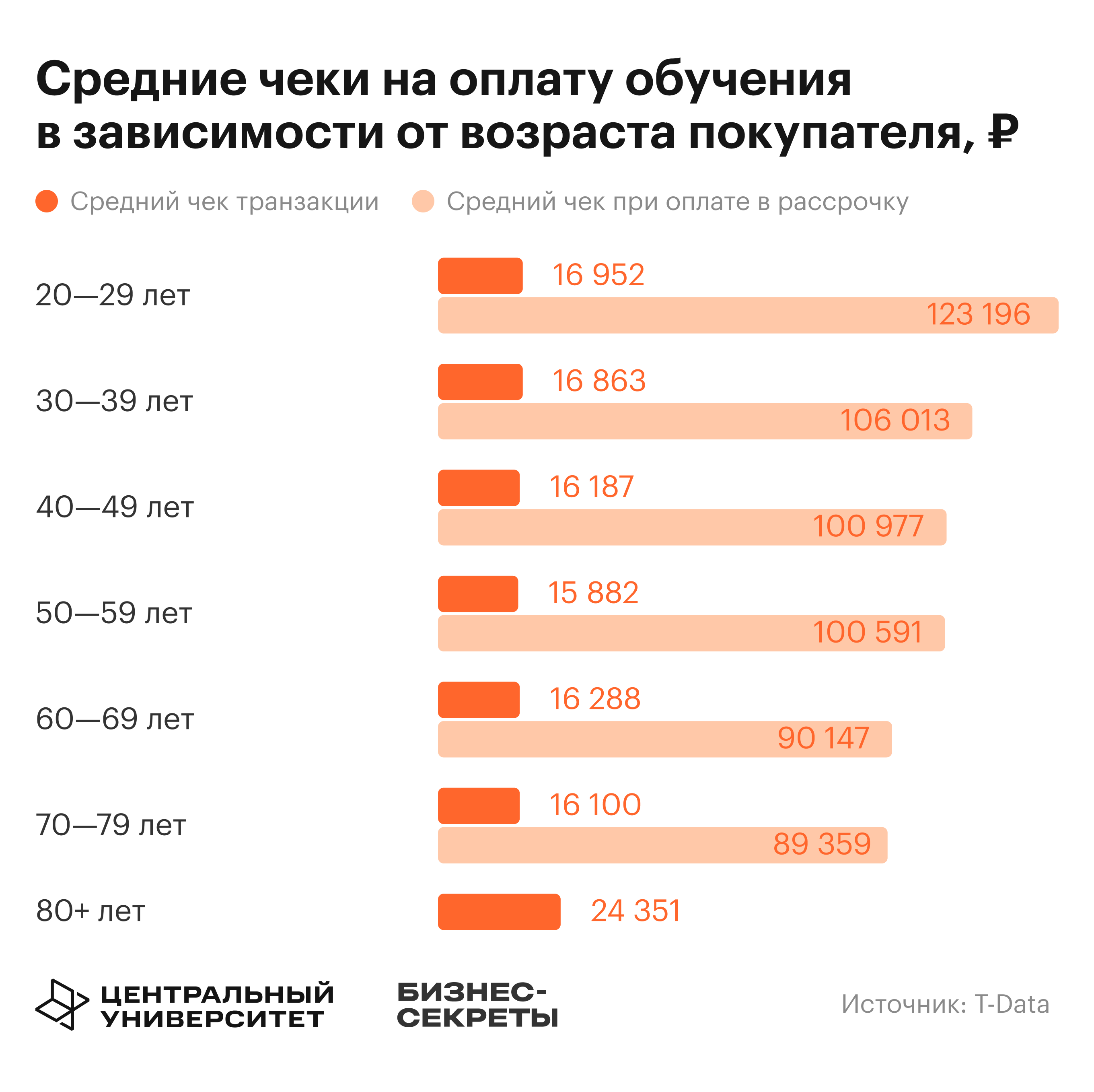 Возраст влияет не только на тематику обучения, но и на механику оплаты. Средний чек при единовременной оплате практически не различается по возрастным группам от 20 до 79 лет — варьируется от 15 882 до 16 952 ₽. Исключение — группа 80+ лет (24 351 ₽).