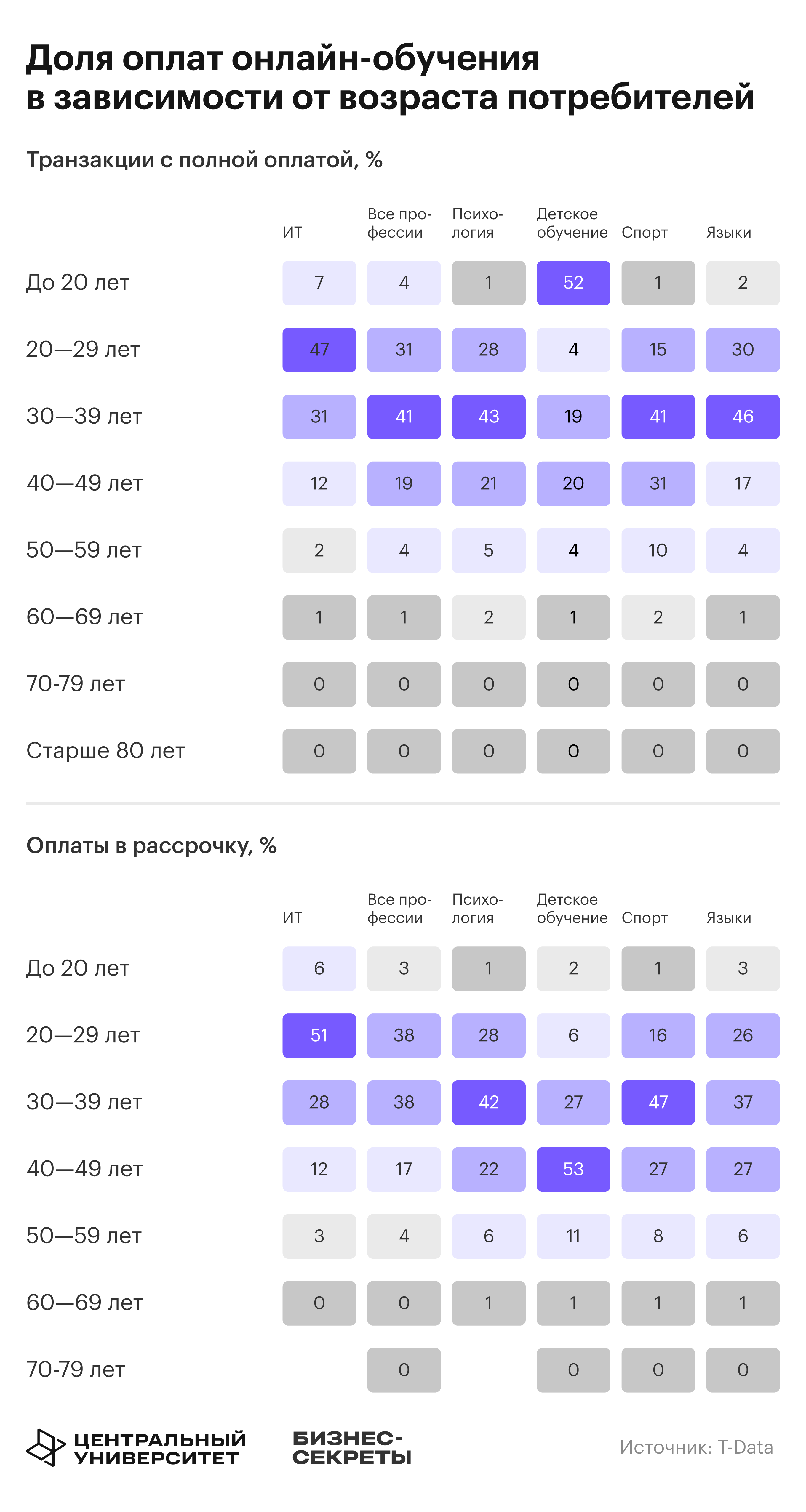 В ИТ-сегменте наибольшая доля покупок в рассрочку приходится на аудиторию 20—29 лет. В детском обучении — 52,5% рассрочек оформляют люди от 40 до 49 лет. В первом случае заметно сохранение высокого спроса на ИТ-профессии среди молодых людей, во втором — оплата родителями долгосрочного обучения своих детей.