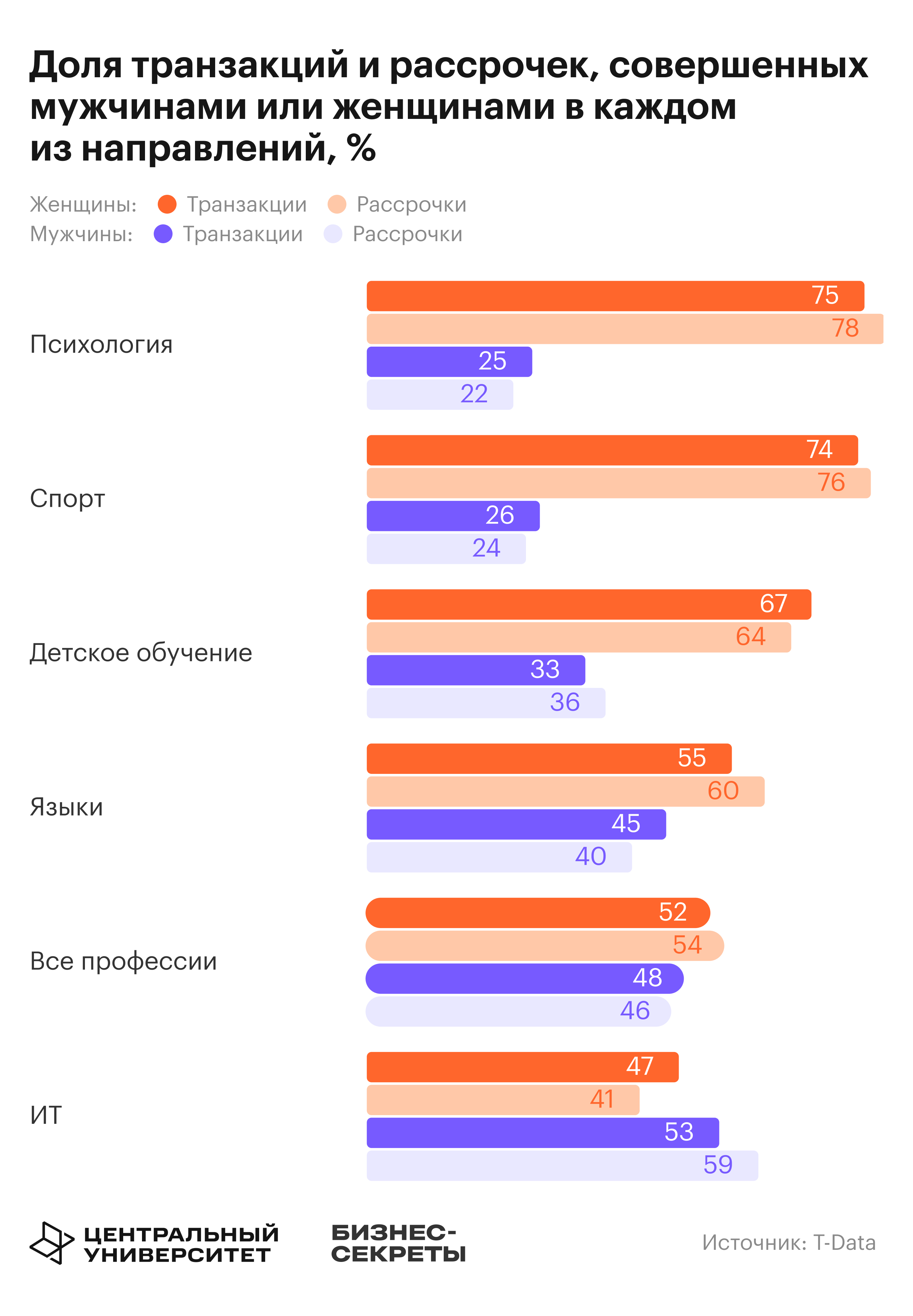 В «Детском обучении» женщины совершают 67% всех транзакций и оформляют 64% рассрочек. В «Языках» они также в большинстве: 55% транзакций и 60% рассрочек.