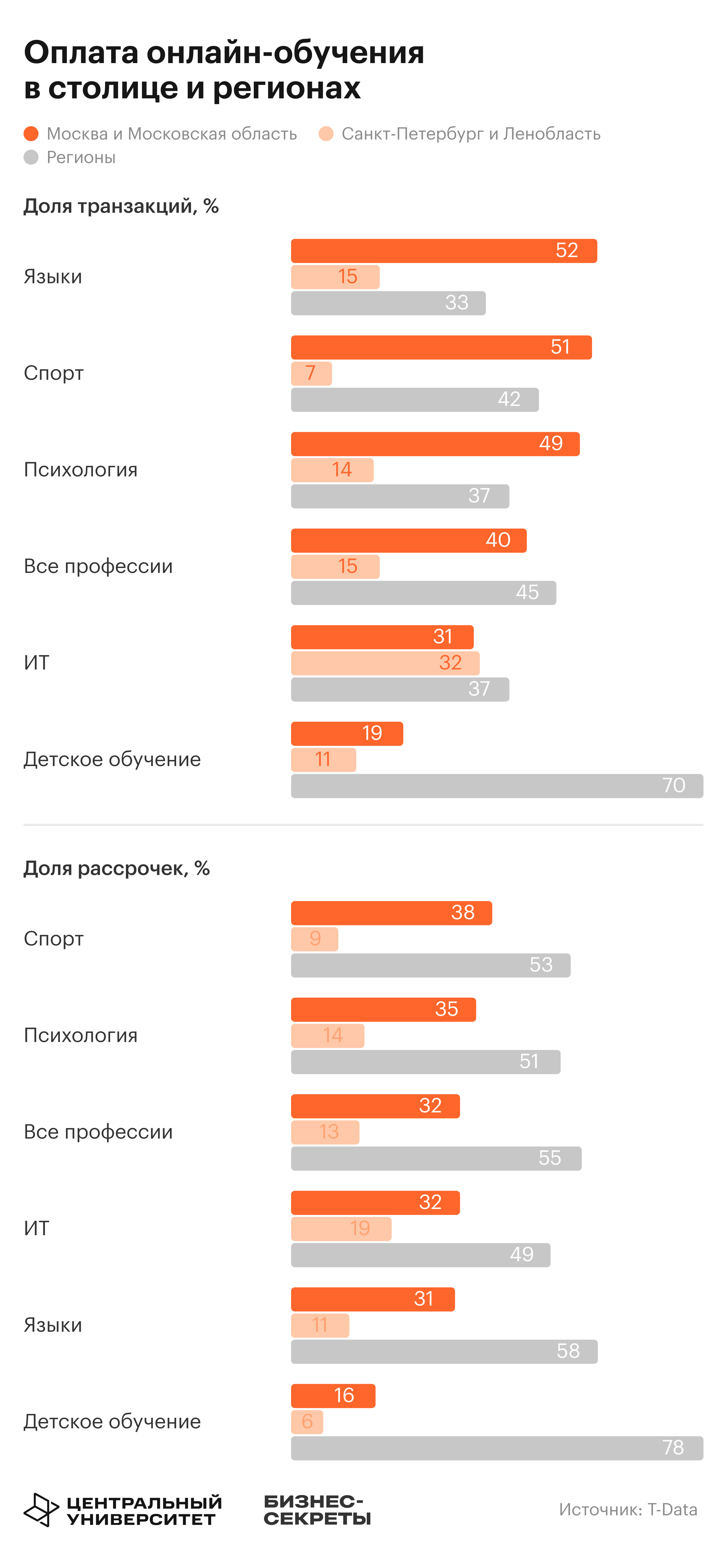В большинстве категорий обучения доля транзакций из регионов превышает 35—70%.