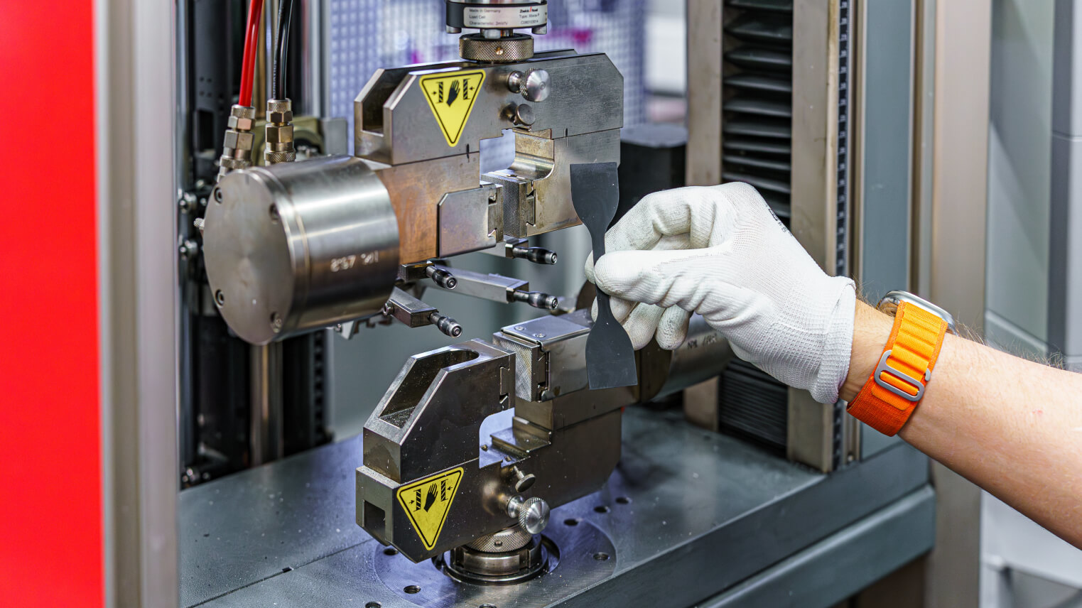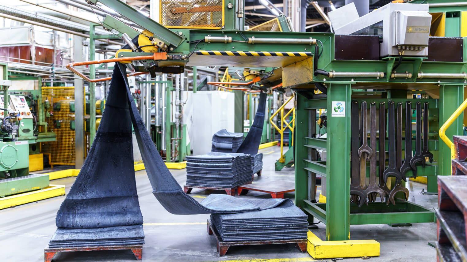 Конвейерная лента доставляет сырье к промышленному миксеру, и автоматика контролирует дозировку каждого компонента, загружаемого в аппарат. Процесс резиносмешения состоит из нескольких этапов, каждый из которых проходит в строгой очередности и при определенной температуре от 90 до 180°С. Финальная готовая смесь превращается в ленты. Для контроля качества из них вырезают тестовые фрагменты и проверяют их в лабораторных установках — например, на прочность к разрыву. Если тестирование не пройдено, партию отправляют в брак. Если пройдено, отправляют на производство компонентов для сборки шин.