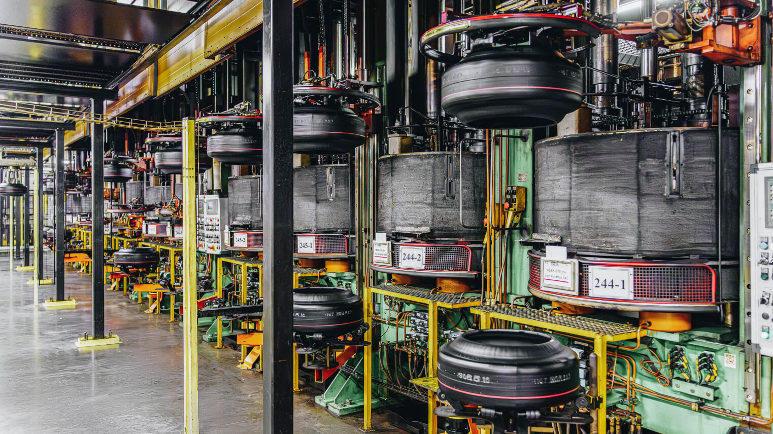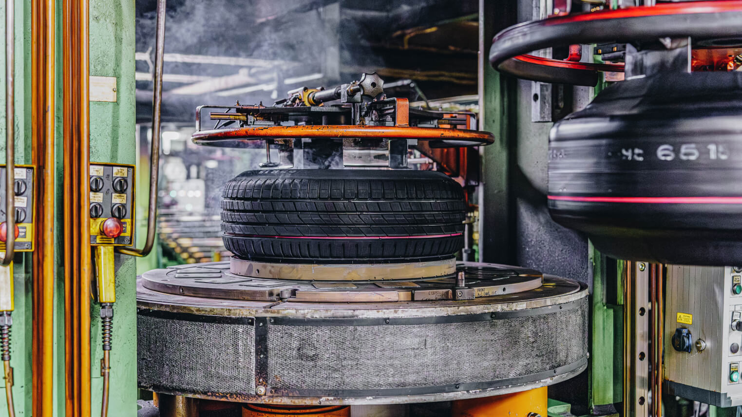 Из готовой протекторной ленты, бортовых крыльев, корда и стального брекера собирают заготовку шины. Затем она проходит вулканизацию. Ее укладывают в пресс-форму с рисунком протектора и боковин конкретной шины, причем автоматика проверяет соответствие заготовки пресс-форме. Затем горячий пар под давлением около 15 атмосфер прижимает заготовку к разогретой до 200°С форме — так на шине отпечатывается рисунок протектора, а резина приобретает окончательные физические свойства.