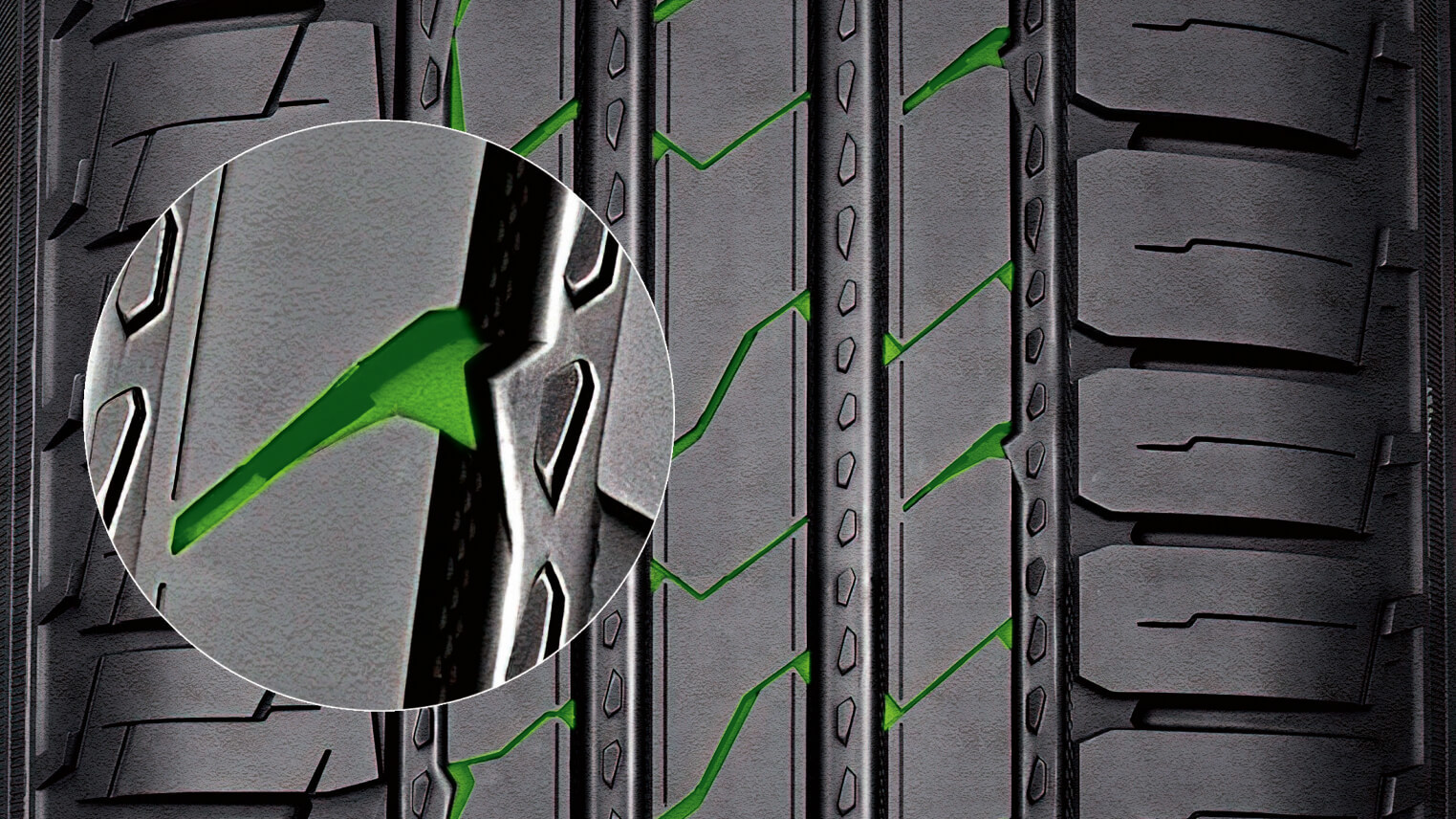 Чтобы сделать шину тише, применяется неочевидное решение: многочисленные полусферические углубления в стенках продольных каналов протектора. Они уменьшают шум, снижая завихрения воздуха. Кроме того, они охлаждают поверхность шины, а это повышает износостойкость протектора.
