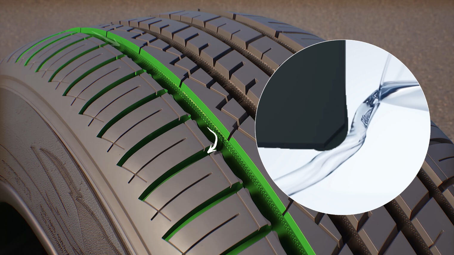 Некоторые решения касаются таких небольших деталей, что они практически незаметны с виду. Однако результаты от их внедрения трудно переоценить. Чтобы снизить риск аквапланирования, шина должна эффективно отводить воду и максимально сохранять сцепление с дорогой. Для этого каналы в протекторе делаются небольшими и сложной формы. Например, поперечные микроканавки в плечевой зоне колеса, выполненные в виде узкой расширяющейся к концу трубы, хорошо вытягивают наружу воду из глубоких продольных каналов. Другой элемент, созданный после тщательных исследований и моделирования, — «пандусы» около поперечных микроканавок. Они создают эффект Коанда, когда поток воды прилипает к внешней стенке продольного канала и через поперечный выводится вовне.