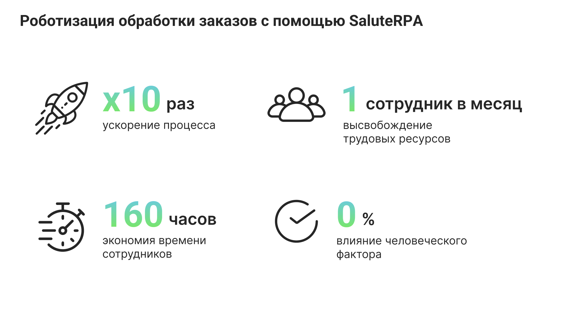 Время обработки данных по заказам сократилось более чем в 10 раз. При этом полностью высвобождено время одного сотрудника ‒160 часов в месяц, а риск влияния человеческого фактора на качество работы снижен до нуля.