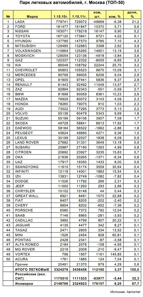 Аналитическое агентство «Автостат» выпустило новое исследование автомобильного рынка Москвы, основанное на данных о регистрации в ГИБДД. Учитывалось число стоящих на учете легковых машин на 1 октября 2011 г. в сравнении с прошлогодними данными.
