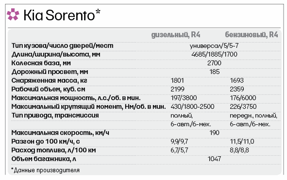 Российскую цену кроссовера, который начнут продавать у нас еще до конца года, нам не назвали, но пообещали, что за дизайн и прочие новшества в Sorento 2013 лишних денег не возьмут: базовая модель будет стоить ровно столько, сколько и нынешняя плюс дополнительные опции. На тестируемых в Барселоне авто опций было более чем достаточно, чтобы убедить нас и окружающих, что у этого «корейца» все как у больших. А может, и не надо уже никого убеждать? У подруги, помешанной на Sorento, угнали аж два автомобиля этой модели, и если первая кража, пять лет назад, выглядела как ошибка угонщиков, то недавняя свидетельствует о некоторой переоценке автоценностей в криминальном мире. Воры ошибаются редко.