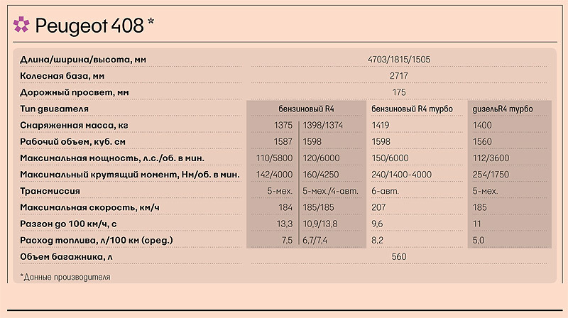 В общем и целом Peugeot 408 отменно справился с задачами, которые мы перед ним ставили и под Калугой, и под Севастополем: хорош на равнине и в горах, потрясывает, но в меру, на каменистой или грунтовой дороге и довольно приемист для «семейного» автомобиля. 408-й аж на треть состоит из российских комплектующих: это задние фонари и бензобак, покрышки и диски, системы шумоизоляции, электропроводки и выхлопа, бамперы и некоторые детали кузова, стекла, сиденья и передняя панель.