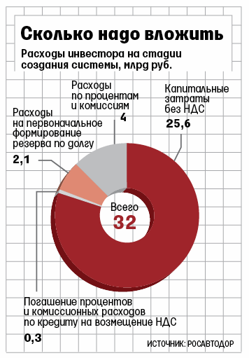 Создание системы полностью профинансирует частник (см. график). Чтобы компенсировать затраты инвестора, Росавтодор будет с 2014 г. ежегодно перечислять ему фиксированную плату – 11,17 млрд руб. (в ценах 2012 г.), а всего до 2025 г. – 124,7 млрд.