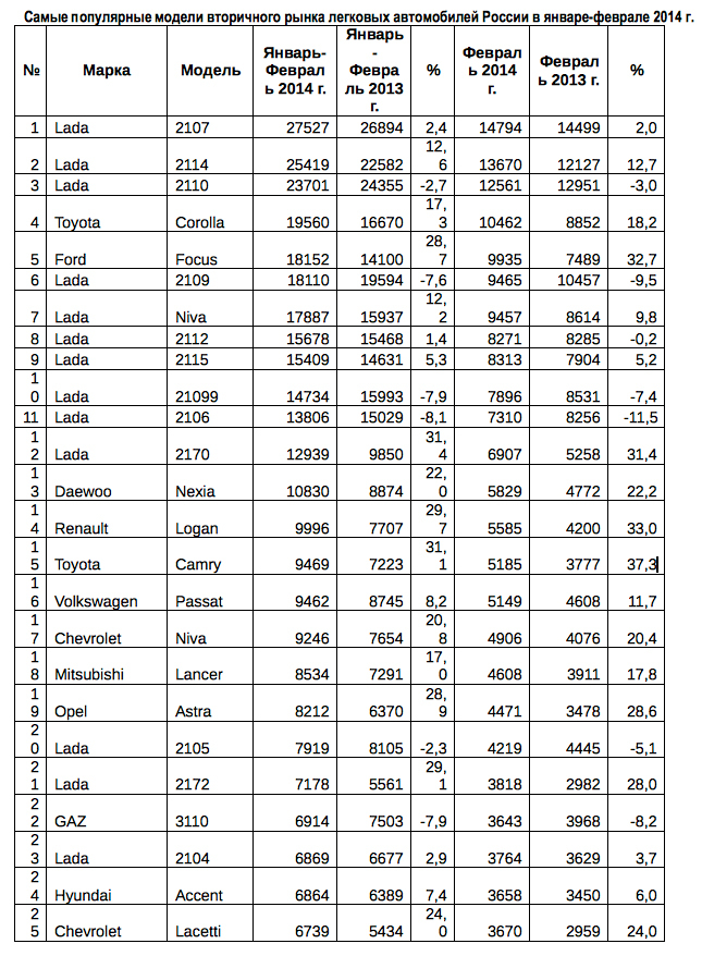 Количество проданных на вторичном рынке автомобилей в России в феврале 2014 г. выросло на 17,1% в сравнении с аналогичным месяцем прошлого года, до 429 900, сообщает аналитическое агентство «Автостат». Продажи традиционных лидеров рынка подержанных автомобилей - Lada и Toyota - выросли на 4,4% (130 391 шт.) и 22% (52 017 шт.). Продажи подержанных Nissan выросли на 27,7% (22 701), Hyundai - на 25,3% (15 439), Chevrolet - на 30,1% (17 117), Kia - на 39,7% (11 225), Renault - на 30,9% (12 268).