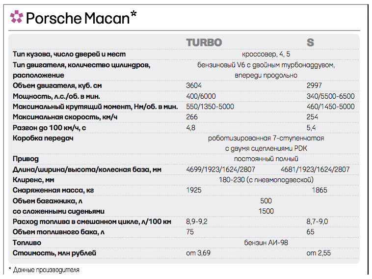 Мы отправляемся проверить скоростные качества на кольцевой трассе автодрома. На выбор у нас обе версии, которые будут поставляться в Россию: «простая» S (340 л. с.) и топовая Turbo (400 л. с.). Держаться за пейс-каром, в роли которого выступает 911-я модель, на Turbo удается довольно легко. В скоростных поворотах хорошо чувствуется преимущественно заднеприводный характер машины, а появление тяги на передних колесах замечаешь на выходе из виража, когда корпус машины неожиданно легко выправляется из заноса. Кроссовер неистово визжит покрышками, но кренится не так уж сильно. Конечно, ему трудно с легкостью повторить за распластанным по земле спорткаром самую «острую» шикану Bus Stop. Зато Macan легко перескакивает через полосатые поребрики, прощая своим неискушенным пилотам ошибочные траектории.