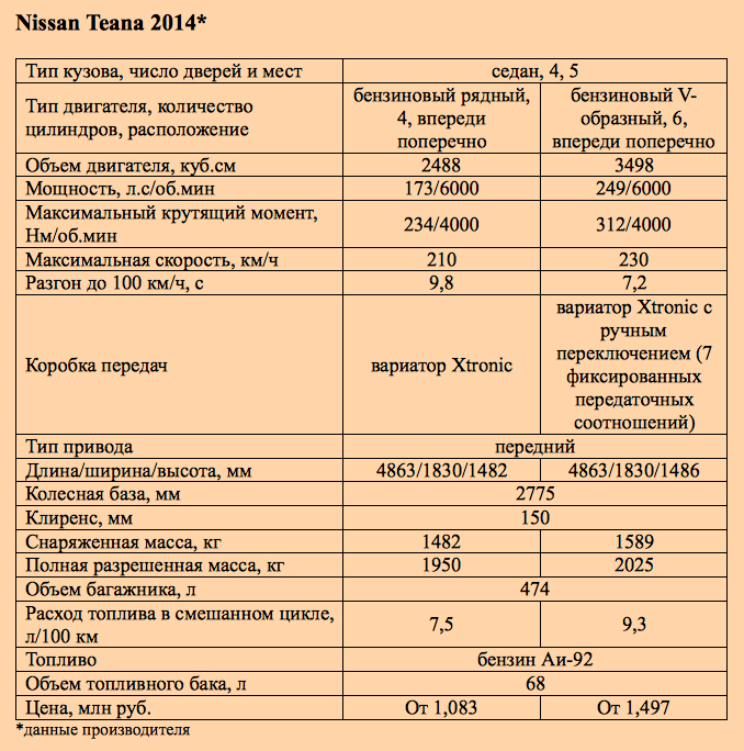 Технические характеристики Nissan Teana