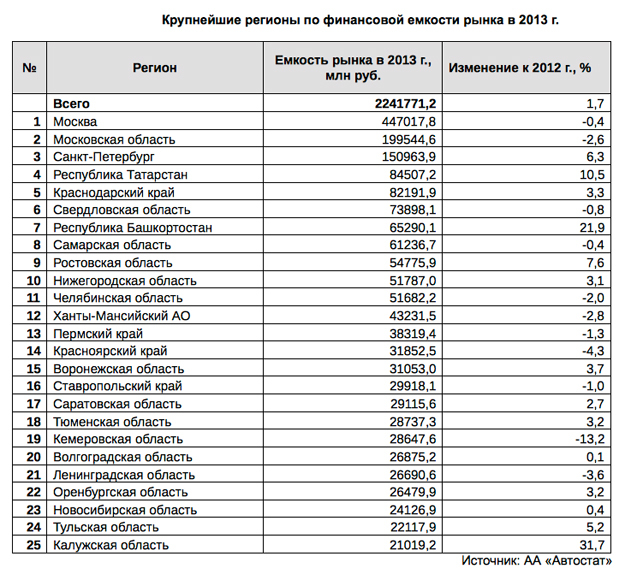 Наибольшая финансовая емкость рынка - у Москвы (447,0 млрд руб.) и Московской области (199,5 млрд руб.), указывается в отчете "Автостата". Оба рынка немного уменьшились по сравнению с 2012 г. - на 0,4 и 2,6% (см. таблицу). На третьей позиции в рейтинге регионов - Санкт-Петербург (около 151,0 млрд. руб.), на четвертой - Республика Татарстан (84,5 млрд. руб.), оба показавшие рост финансовых результатов продаж.