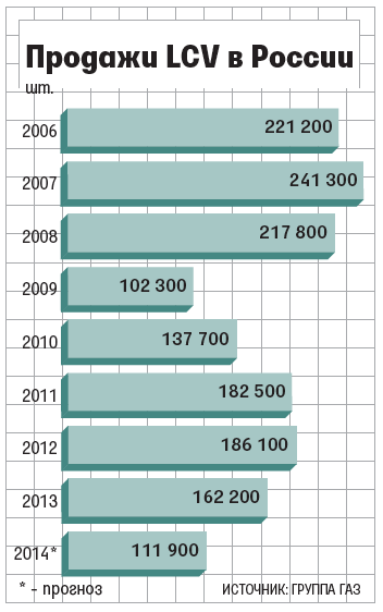 Продажи легких коммерческих автомобилей (LCV) в России в первом полугодии 2014 г., по предварительной оценке, упали на 16% до 57 300 шт., а по итогам года могут сократиться на 31% до 111 900 шт., т. е. почти до уровня кризисного 2009 года (см. график). Это следует из вчерашнего доклада вице-президента группы ГАЗ Елены Матвеевой на заседании экспертного совета при комитете Госдумы по промышленности, посвященном ситуации в автопроме. Продажи ГАЗа за шесть месяцев снизились примерно на 20% до 25 000 шт. В случае серьезного ухудшения ситуации на рынке группа будет вынуждена пойти на сокращение персонала, говорит Матвеева: численность работников ГАЗа может снизиться на 5000 человек, ПАЗа - на 3000. Ранее на такие меры уже пошли «АвтоВАЗ» и завод Ford Sollers во Всеволожске.