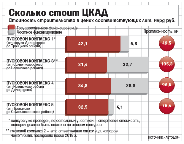 Поручение президента срочно построить ЦКАД оплатят инвесторы - чтобы не затягивать конкурс, «Автодор» увеличит задаток для претендентов на контрактВчера «Автодор» провел для инвесторов презентацию двух самых дорогих секций ЦКАД - третьей и четвертой (см. график). Для их строительства и обслуживания «Автодор» рассчитывает заключить концессионные соглашения сроком на 30 лет. Именно для финансирования этих двух участков будет использовано 150 млрд руб. из фонда национального благосостояния, которые «Автодору» поручил выделить президент Владимир Путин. Он также поручил завершить строительство до конца 2018 г. Необходимость уложиться в установленные сроки может повысить стоимость участия в конкурсах на эти секции ЦКАД.