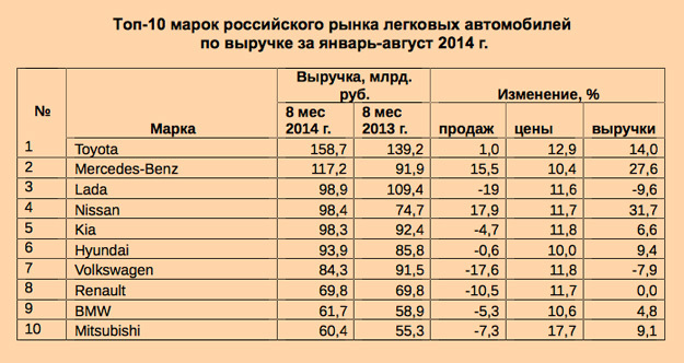 Более половины (64%) всей выручки на российском рынке за первые восемь месяцев года собрала первая десятка брендов: Toyota, Mercedes-Benz, Lada, Nissan, Kia, Hyundai, Volkswagen, Renault, BMW и Mitsubishi (см. таблицу). Продажи «АвтоВАЗа», производителя Lada, по объему выручки опустились со второй на третью позицию, пропустив вперед Mercedes-Benz. Цены на продукцию бренда выросли на 11,6%, однако выручка, по оценке агентства, упала на 9,6%, в том числе из-за падения продаж на 18%.