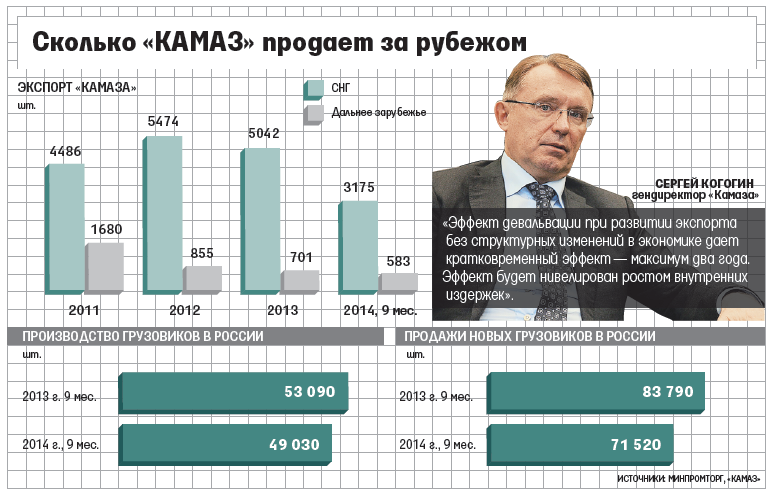 В условиях ослабления рубля выгодно развивать поставки в страны дальнего зарубежья, говорил в интервью «Ведомостям» гендиректор «Камаза» Сергей Когогин. Контракты на поставку грузовиков в страны дальнего зарубежья фиксируются в валюте (в основном в долларах) на момент заключения, а сами контракты долгосрочные, объясняет представитель компании. За год (с 21 октября 2013 г. по 21 октября 2014 г.) рубль подешевел к доллару на 28,4%.
