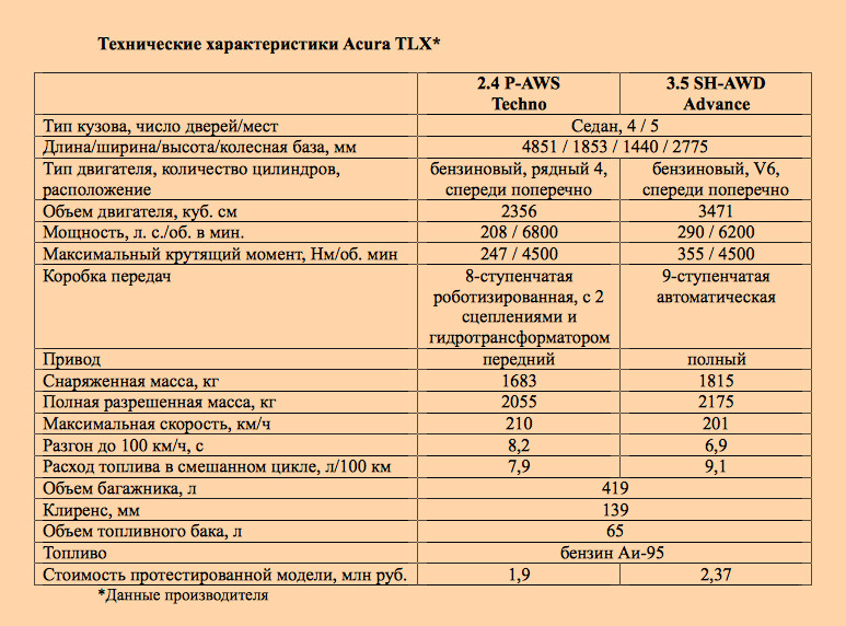 Затруднились в Acura объяснить и то, почему максимальная скорость автомобиля с V6 искусственно ограничена 201 км/ч, когда у менее мощной версии «предохранитель» установлен на 210 км/ч. Зато японцы, несмотря на невысокие планы продаж, провели адаптацию для России: «нашим» TLX добавили подогрев руля, датчик уровня омывающей жидкости, передние и лобовое стекла с улучшенной шумоизоляцией и пластиковую защиту моторного отсека. Также увеличили толщину тормозных дисков и изменили их состав для большей эффективности и долговечности в наших чумазых условиях.