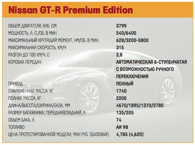 Снаряженная масса полноприводного Nissan GT-R - аж 1740 кг (для сравнения: полноприводный Porsche 911 Carrera 4S, также с двигателем объемом 3,8 л, весит 1465 кг). «Он весит столько, сколько нужно», - объясняют японцы. Понятно, что ни в разгоне, ни в торможении GT-R массивным автомобилем не ощущается. Но вот расход 98-го бензина у GT-R во время нашего теста составил 21,2 л при средней скорости 37,8 км/ч. Не страшно для 540-сильного суперкара? Не страшно. Но у 400-сильного Porsche 911 Targa 4S, что мы брали на тест также в августе этого года - за неделю до теста Nissan GT-R, - расход топлива составил 13,8 л при 37,0 км/ч.